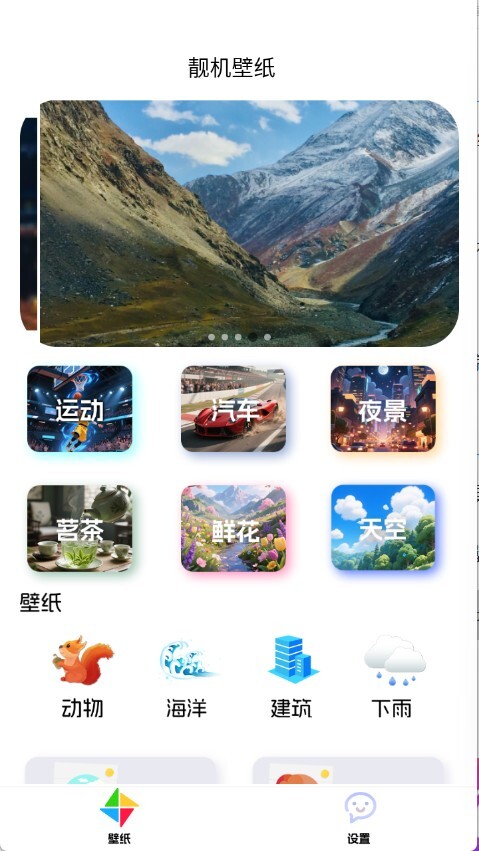 2、壁纸页面整合了丰富多样的壁纸资源类型,涵盖运动、汽车、天空等不同类别。