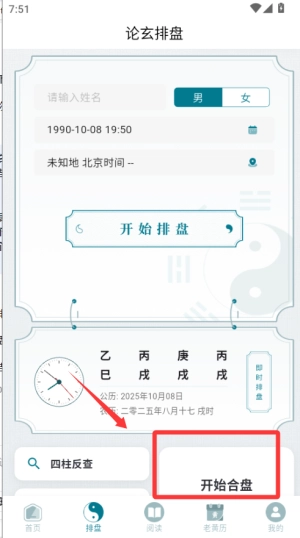 1、启动论玄八字排盘软件,在软件主界面找到并选择八字排盘功能模块,随后准确录入个人的出生日期与具体出生时辰信息。