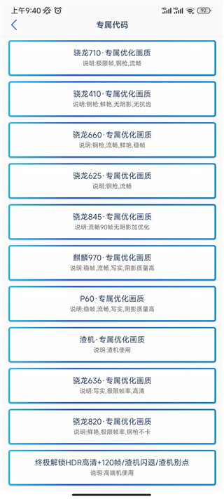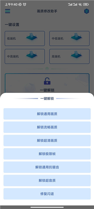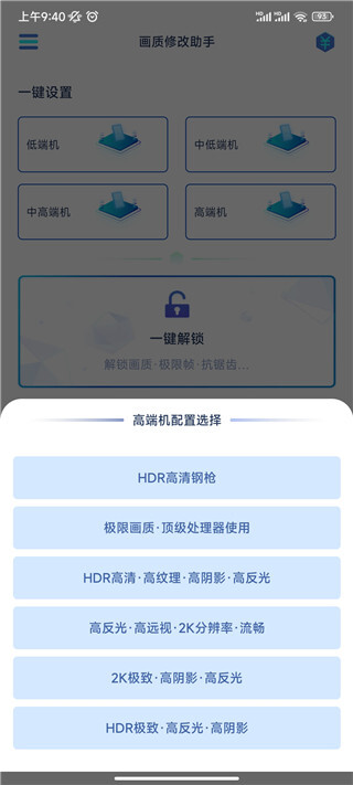 1、打开画质修改助手高级版后,你能够依据自己的手机型号挑选适配的机型配置;
