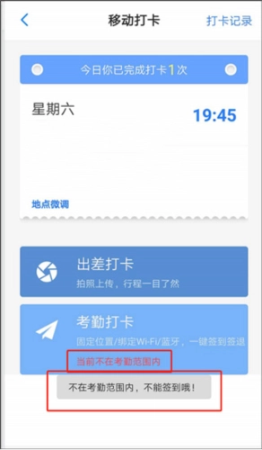 7、若所处位置不在考勤点划定的范围内,系统将显示“当前不在考勤范围内”的提示,打卡操作会显示失败,无法完成签到。