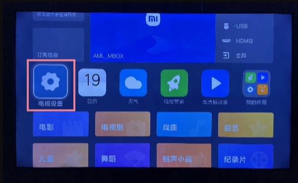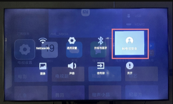 2、在小米或红米电视里找到“设置”,然后进入“账号与安全”选项。