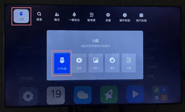 3、把U盘连接到电视上,若出现弹窗就选择“打开U盘”。要是没有自动弹出弹窗,可在电视首页最顶部按“上”键,这样就能找到U盘了。