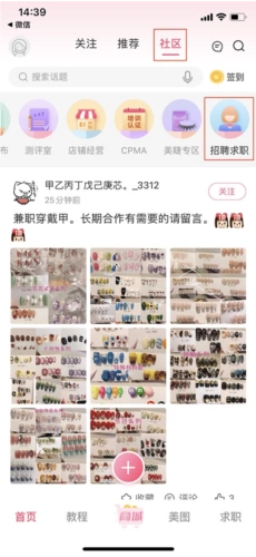 1. 启动美甲帮应用,进入软件界面后,在顶部的菜单栏里找到并点击“社区”这一选项。