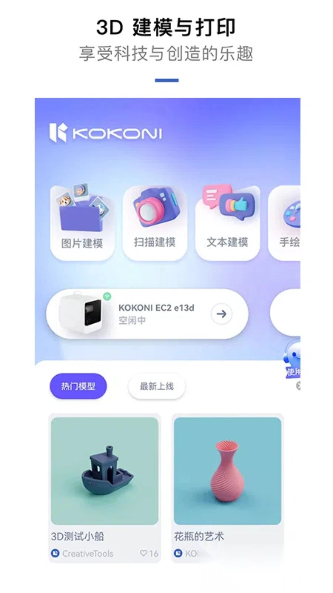 这款KOKONI 3D应用能让毫无基础的用户轻松玩转3D建模和打印控制。它打造了一个从二维图像到三维实物的创意平台,只要连接上配套的KOKONI 3D打印机,用户就能解锁全部功能,尽享创作的无限乐趣。