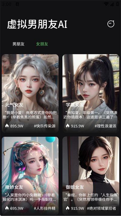 在虚拟男朋友聊天模拟器软件里,也有不少形象各异的靓丽女朋友AI角色可供挑选,快来和她们畅快聊天吧!