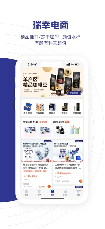 “爆品思维”驱动的电商板块: 应用内整合独立电商频道,销售精品挂耳、冻干咖啡及联名水杯等零售商品。通过“9.9元起包邮”等策略,将线下爆款饮品延伸为可囤货的零售产品,构建第二增长曲线。