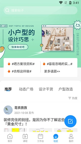 4、社区页面展示着其他用户的分享内容与改造效果图纸,你也能在这里进行点赞、收藏和评论互动哦!