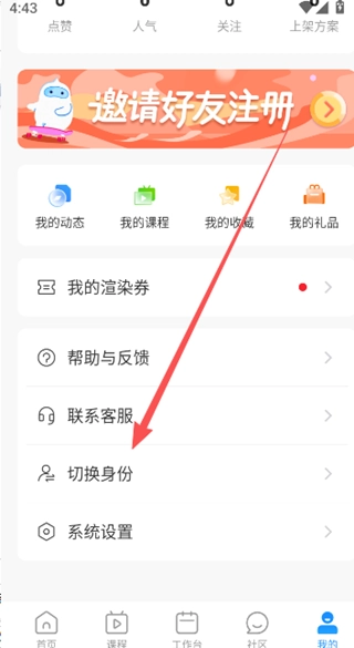 1、登录软件后,进入“我的”界面,在界面下方的功能选项里找到“切换身份”这一功能。