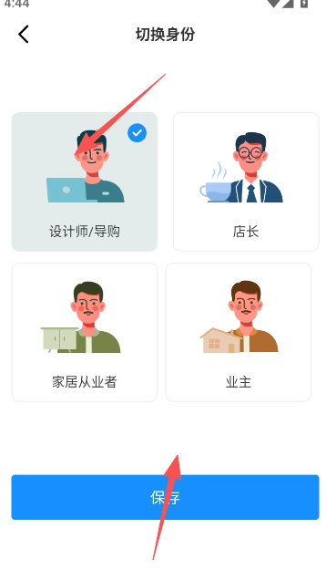 2、点击切换为设计师/导购、店长、家居从业者或业主后保存。
