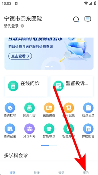 打开闽东医院应用,点击底部导航栏中的“我的”选项,即可进入登录界面。