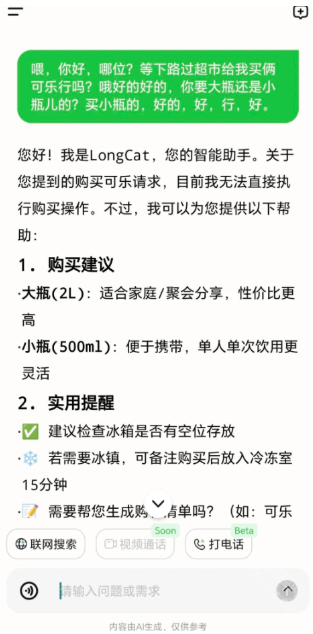 2.输入语音,LongCat可以识别出人声信息,并给出相应意见