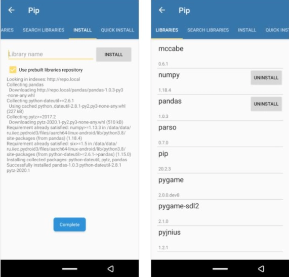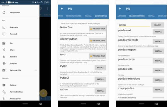 完成所有设置后,就能像在电脑上那样,通过pip为项目安装软件包了。Pydroid 3配备了一个界面,无需在终端输入命令,就能直接安装软件包。