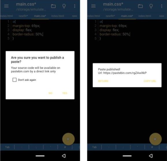若您有分享的意愿,可以在Pastebin平台上把自己的知识与进步展示给其他人。操作步骤如下:首先点击应用程序左上角的三条菜单图标,接着选择Pastebin选项并点击确认,然后在弹出的后续菜单中,点击“复制URL”按钮,这样就能将链接复制到您的源代码里了。