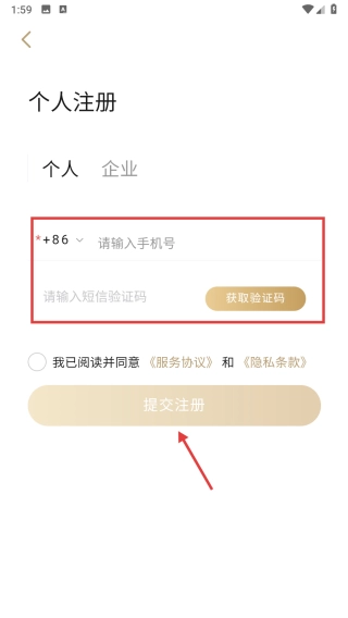 在个人注册页面,输入手机号与短信验证码,接着点击提交注册按钮,即可完成账号注册流程。