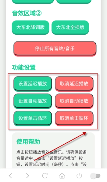 2、在功能设置里,点击“设置延迟播放”“设置自动播放”“设置单击循环”这些选项就能开启对应的功能,也可以通过点击“取消”类按钮来关闭;点击“停止所有音效/音乐”则会暂停当前正在播放的音频。