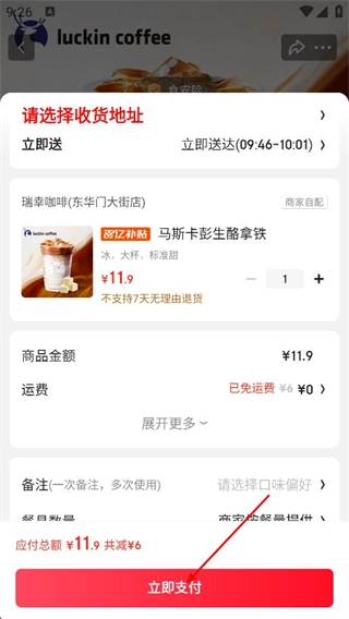在订单确认页面,选定收货地址后点击立即支付按钮,即可完成外卖订单的提交操作。