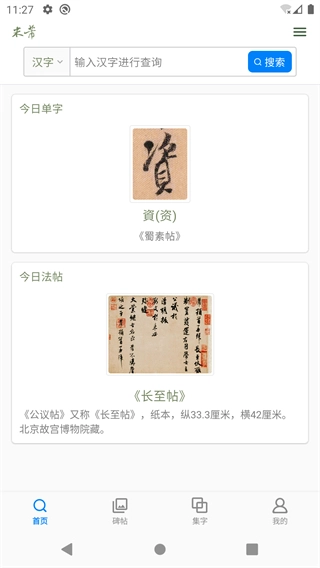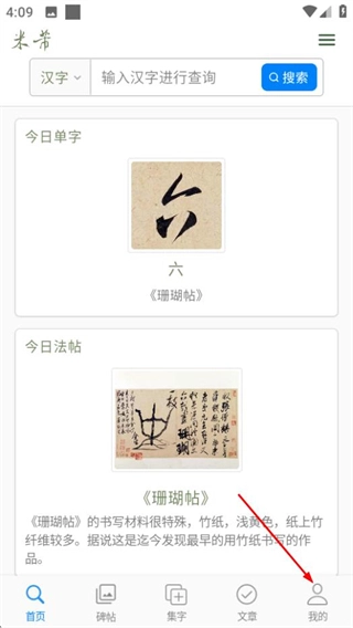 在米芾书法字典的首页,点击页面底部的“我的”选项,即可进入个人中心页面。