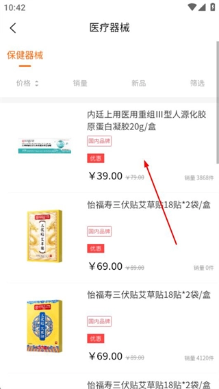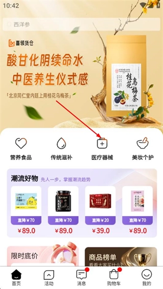 在喜领货仓的首页,找到并点击“医疗器械”分类选项,即可进入医疗器械商品的列表页面。