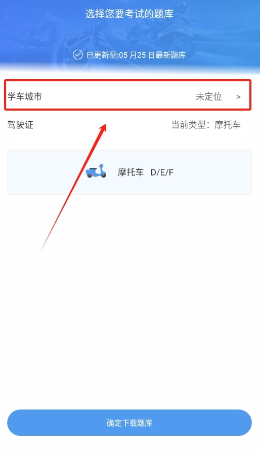 进入后先选择你所在的城市或地区,系统便会自动匹配当地最新的考试题库。