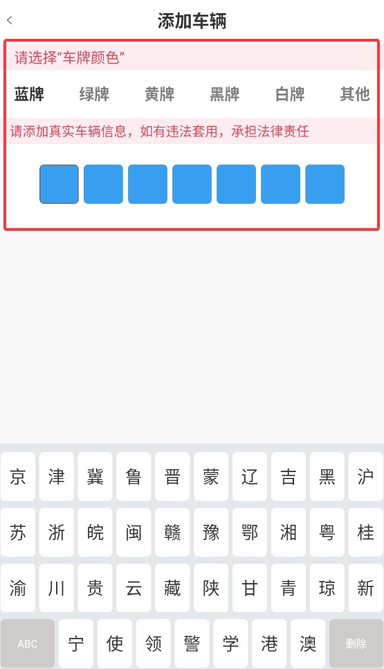 在车辆信息录入界面,需如实填写车牌号、车型等相关资料,该系统支持同时添加多台常用车辆的信息。