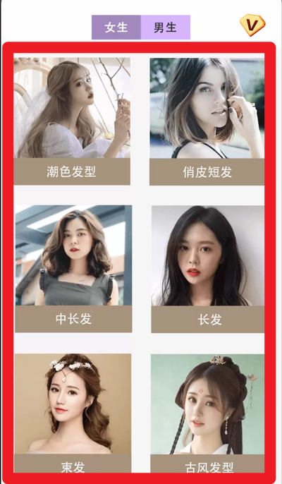2、进入【女生/男生分类】后,能挑选潮流发型、俏皮短发、中长发、古风发型等各类不同的发型类型。