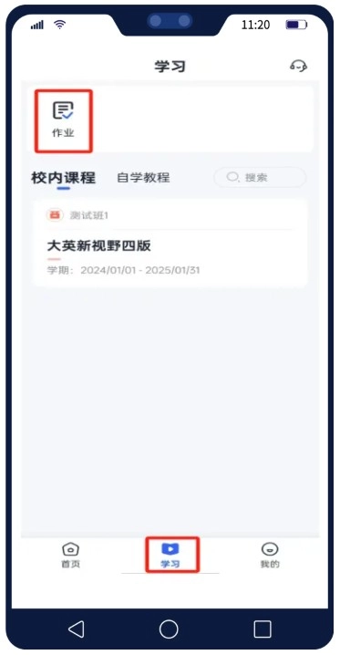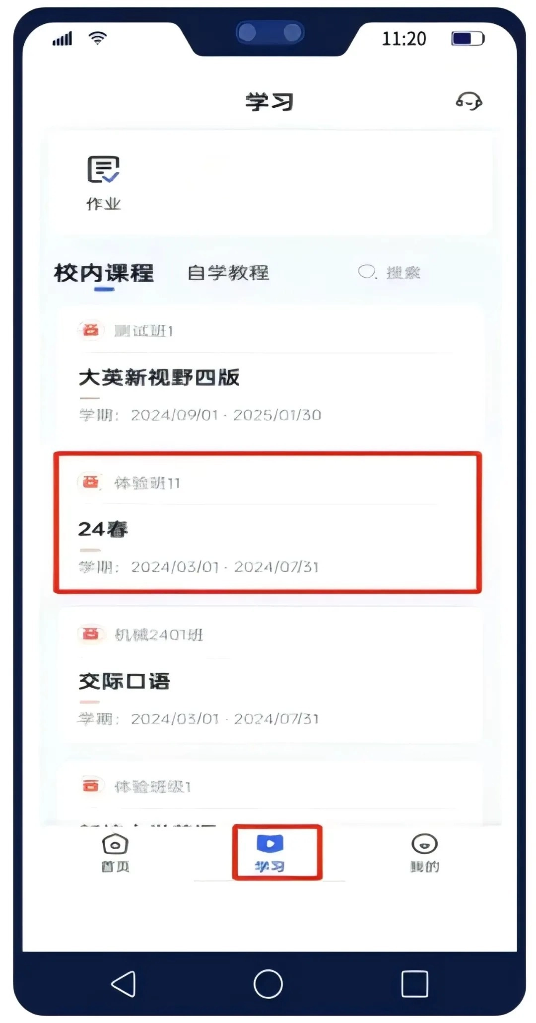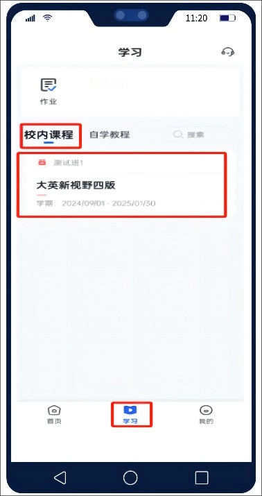 进入,点击页面下方【学习】,【校内课程】中是当前班级中的课程。点击对应课程,查看该课程中的全部教程。