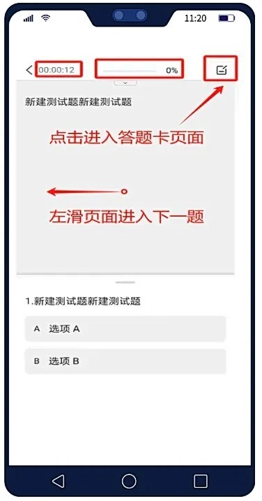 作答页面最上方显示作答时间和进度。作答后,左滑页面,进入下一题。全部作答完毕后,点击右上角答题卡按钮,进入答题卡页面,查看作答情况并提交。