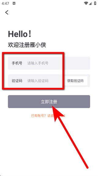 在雁小侠的注册界面,填写手机号并输入验证码后,点击“立即注册”按钮,即可完成注册流程。