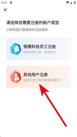 在账户类型选择界面,点击“其他用户注册”选项,即可跳转至注册页面。