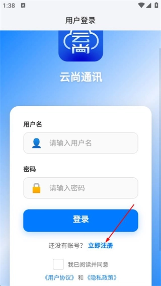 在云尚通讯的登录界面,选择立即注册按钮,跳转至注册页面。