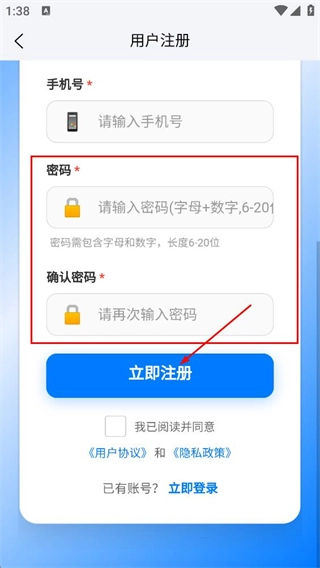 在注册页面,输入密码并再次确认密码后,点击“立即注册”按钮即可完成注册流程。