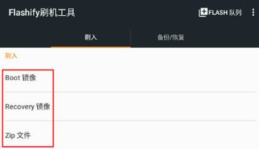1、打开flashify应用,点击“Boot镜像”“Recovery镜像”或者“Zip镜像”选项。