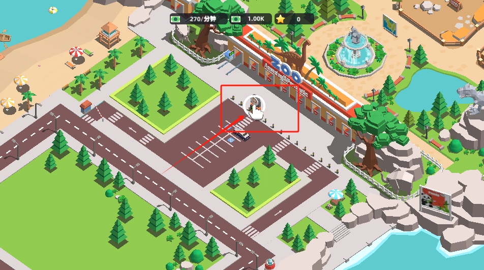 红框标注的是冰淇淋摊,点击它就能进行升级操作,右侧的沙滩区域可以用来建造新的设施。