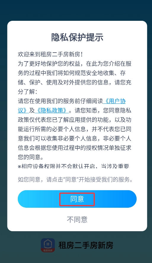 首次打开租房、二手房、新房相关功能时,系统会弹出用户协议确认窗口,点击“同意”后才能进入应用主界面。