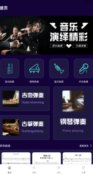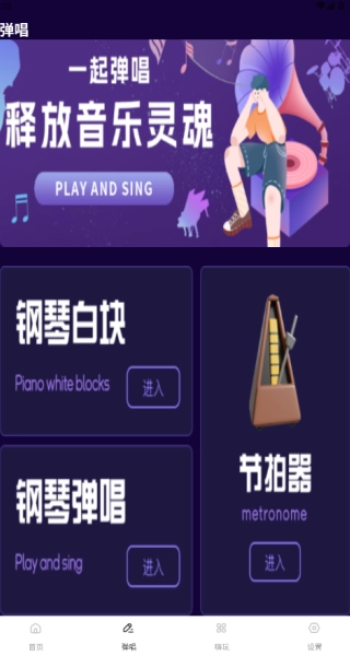 打开软件后,界面中会呈现吉他弹奏、钢琴弹奏、古筝弹奏等选项,你可以从中挑选自己感兴趣的来进行弹奏。