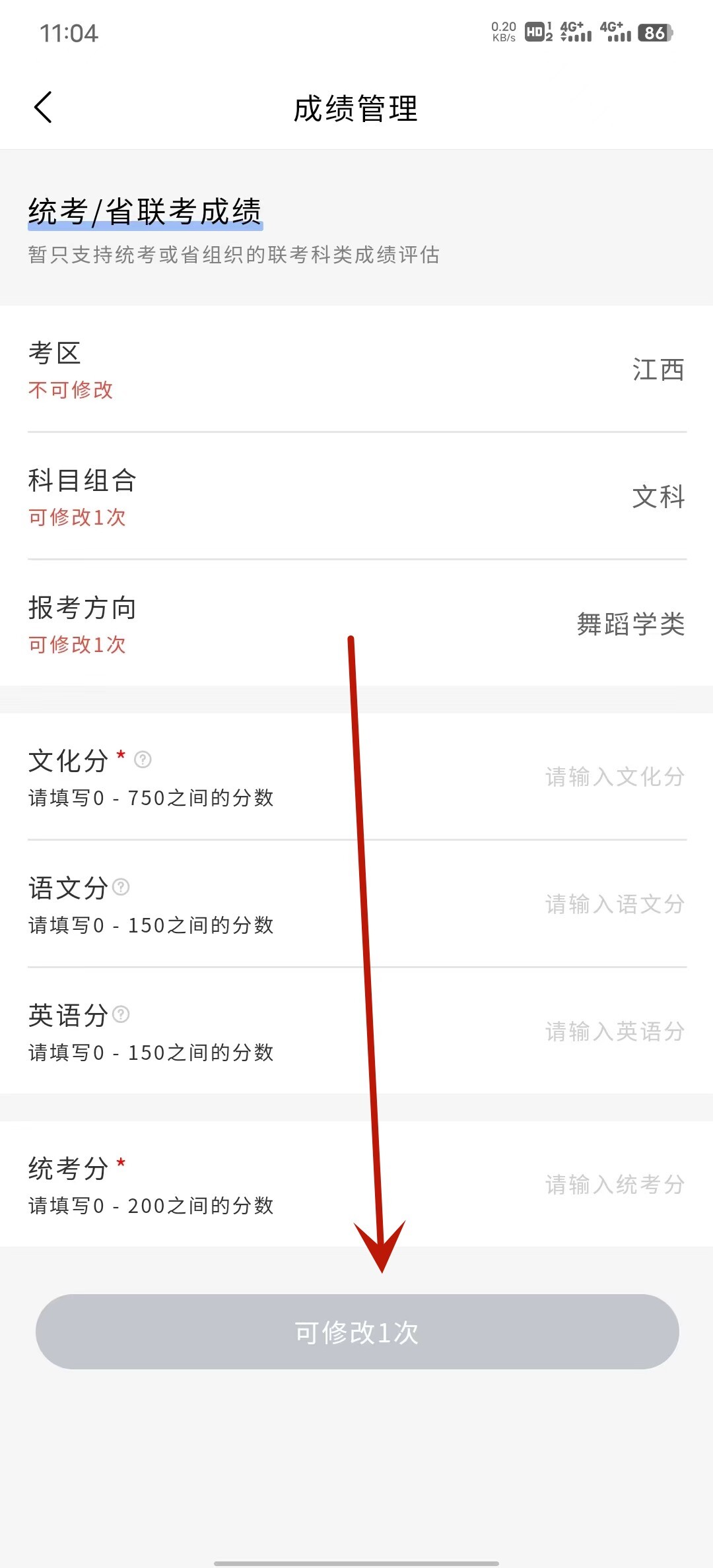 4、填写对应的文化分、语文分、英文分及统考分,点击“可修改一次”按钮提交信息,即可完成信息填写。
