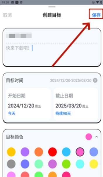 2、用户可以为自己计划创建的目标填写名称,写下一句鼓励自己的话语,并且能够设置目标的时间、颜色等相关信息。