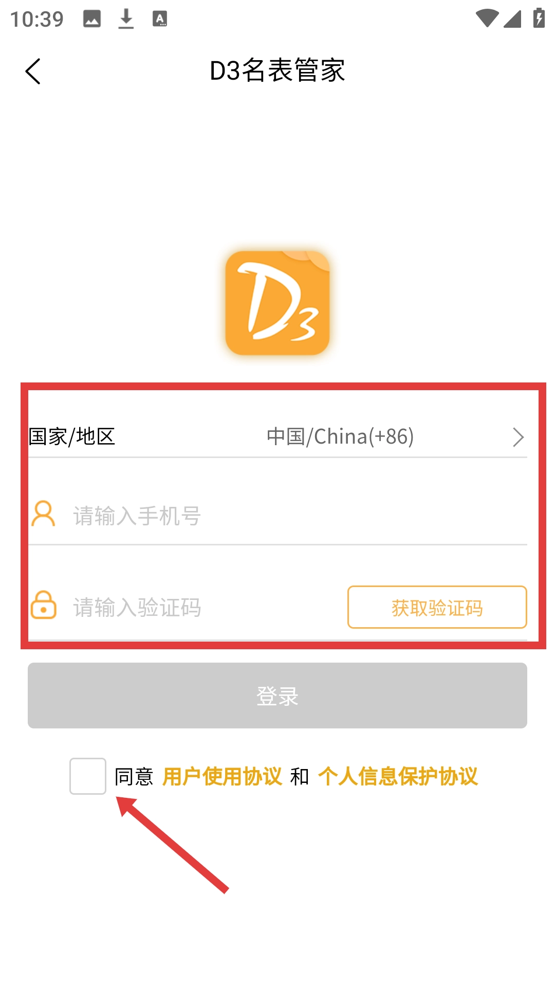 在验证码登录页面输入信息后,勾选【同意协议】。