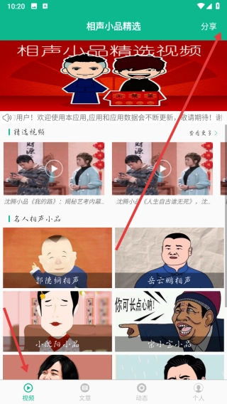 相声小品精选是一款实用的相声小品类应用,它汇聚了相声与小品内容,还包含历届经典的相声小品相关文章供用户阅读。在相声板块,有郭德纲、岳云鹏、曹云金等演员的精彩相声视频;小品板块则收录了沈腾、宋小宝、贾玲等搞笑明星的精彩小品视频,欢迎大家前来观看体验。