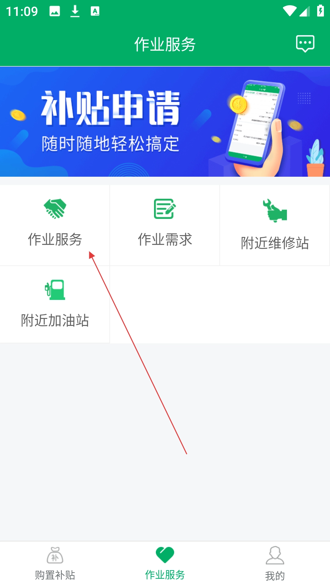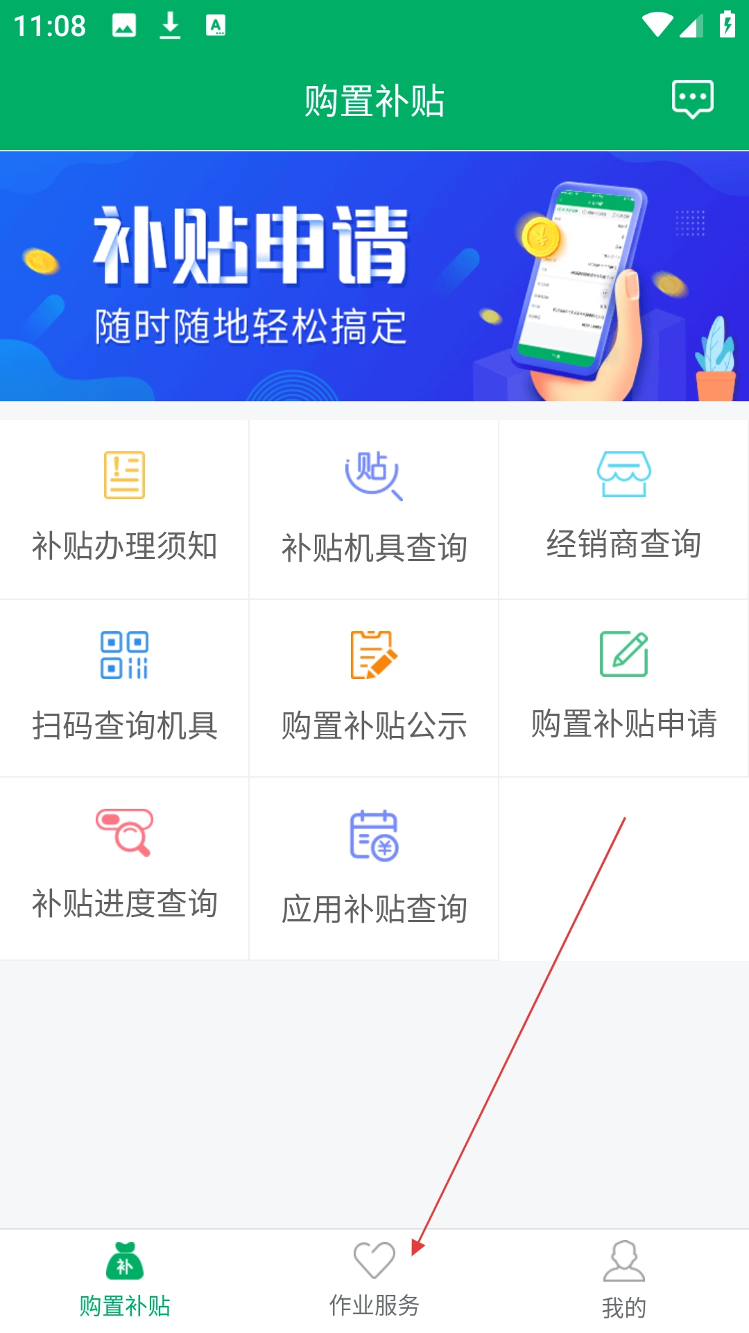 打开农机补贴应用,接着点击页面底部的【作业服务】选项,即可进入对应的服务专区。