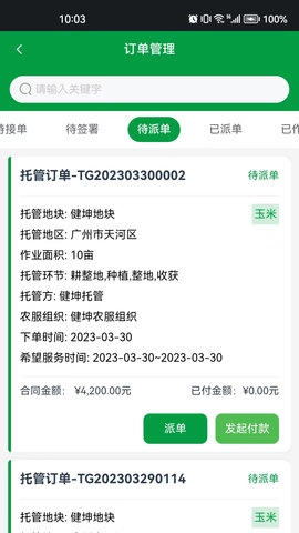 支持农业服务交易,既可以托管下单、管理地块与订单,也能在团购商城采购农资。