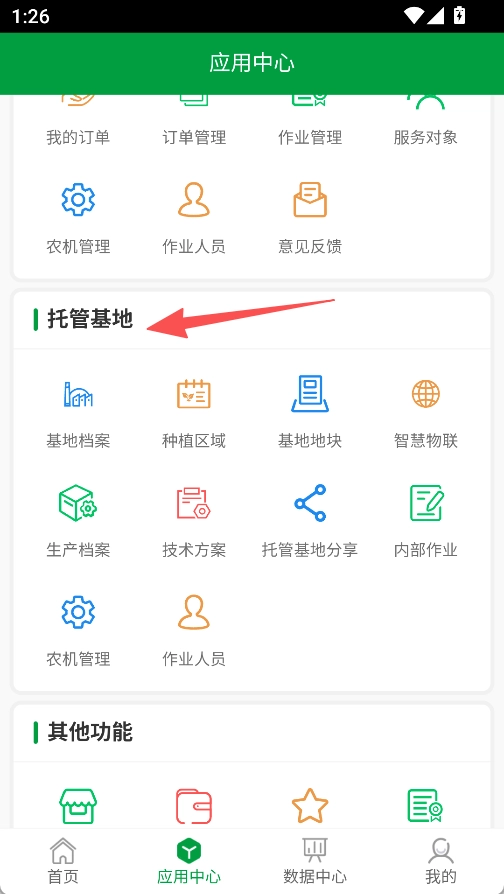 进入应用中心后,找到托管基地板块,点击基地档案来完善地块信息。