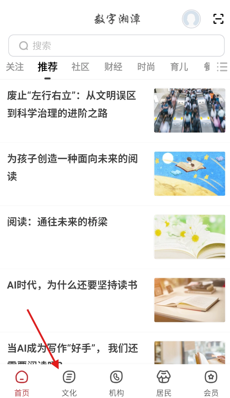 打开数字湘潭软件后,在界面底部的导航栏里找到“文化”选项并点击它。