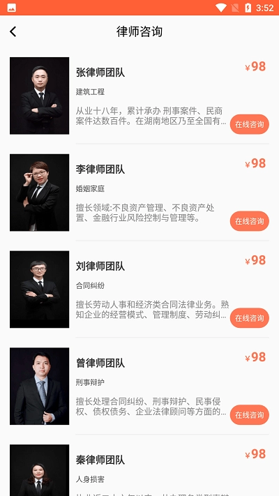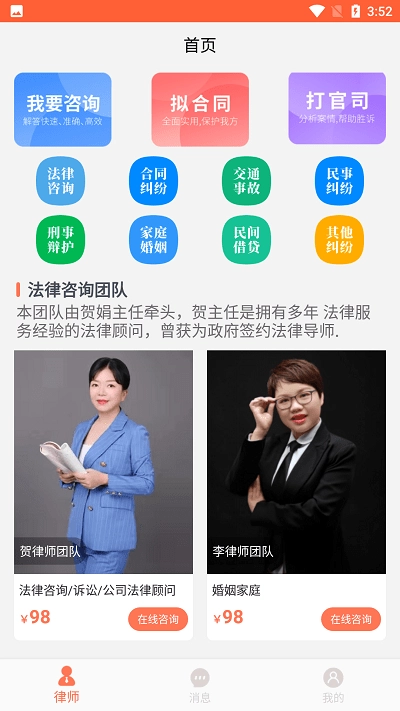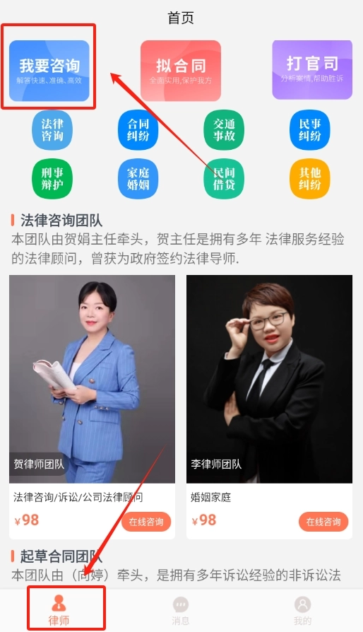 点击进入律师服务板块,您既能够在线与律师开展图文形式的咨询交流,也可以便捷地委托律师处理各类法律事务。