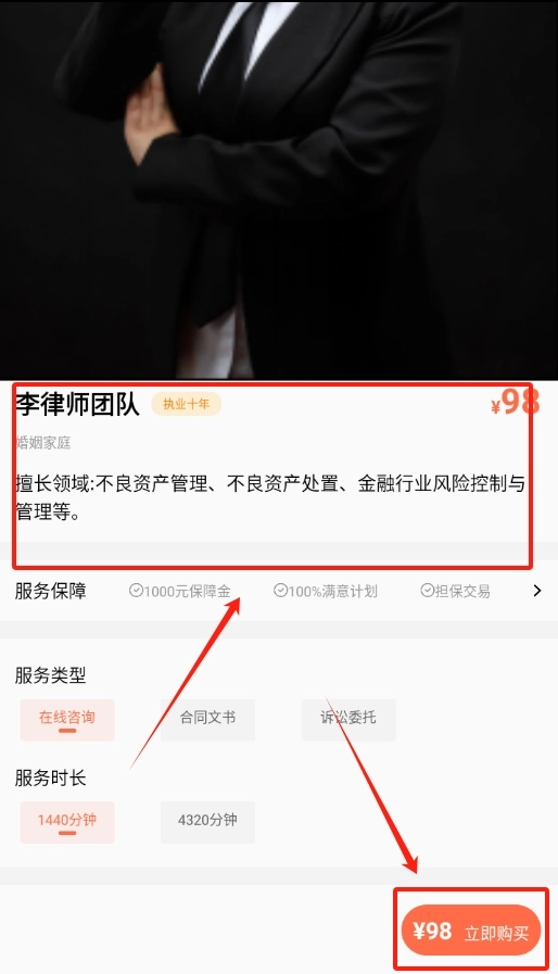 若有咨询需求,可在律师详情页的右下角找到“立即购买”按钮,点击该按钮即可启动咨询流程。
