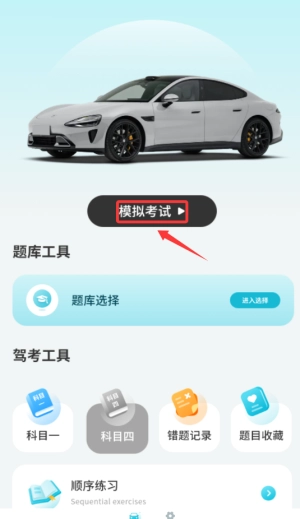 打开考驾照通应用后,在首页的导航栏里找到并点击“模拟考试”选项,即可进入全真试题库进行练习。