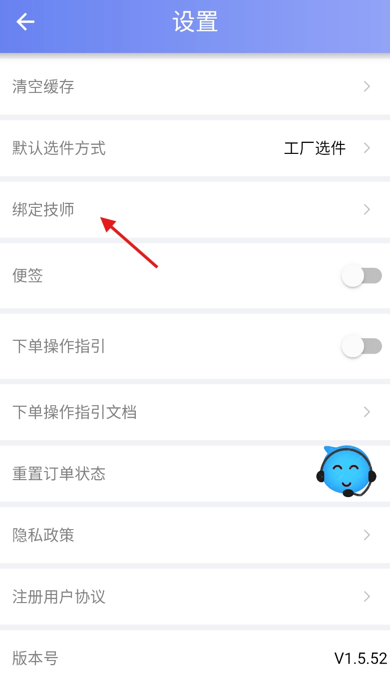 在设置页面中,找到用于关联人员的“绑定技师”功能选项,点击进入该选项。
