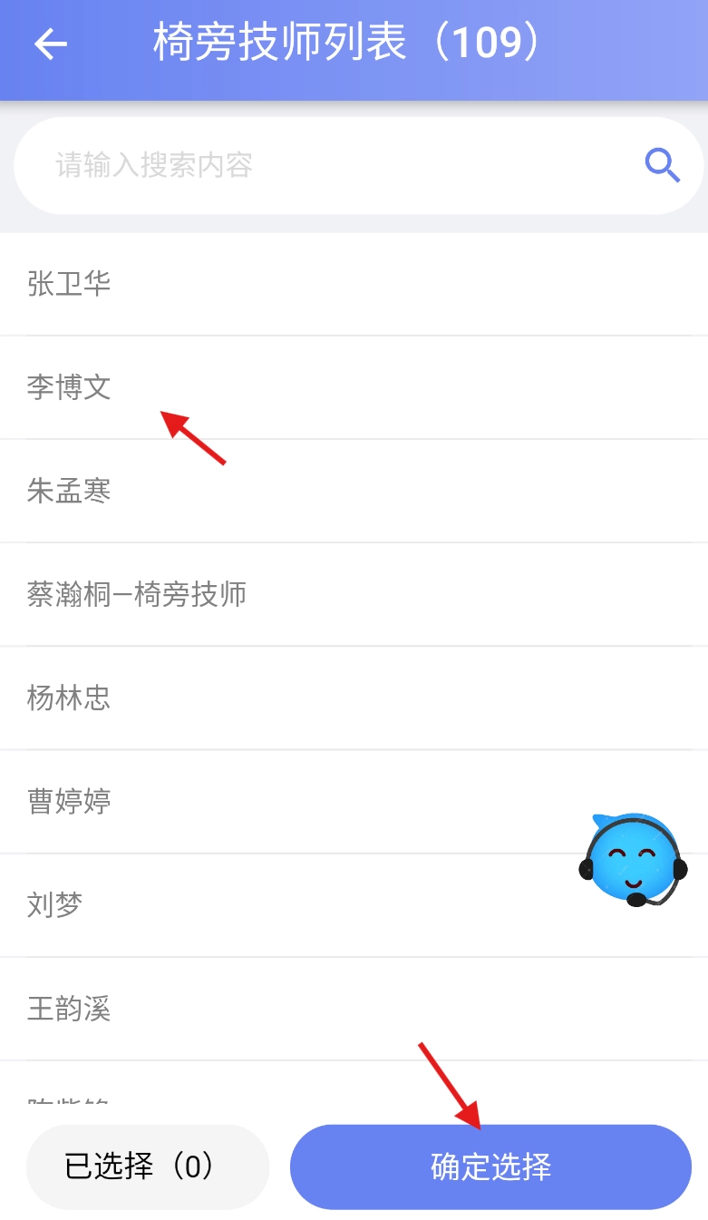 你可以在技师列表里挑选自己需要的技师,选好之后点击“确定选择”按钮,这样就能完成绑定了。