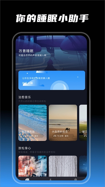 拥有覆盖多种场景的丰富音频素材,用户可按个人喜好自由筛选,一键点击即可播放专属助眠音乐。