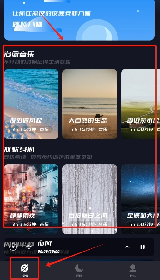 打开木鱼睡眠软件,首先看到的首页“探索”板块,展示着不同风格的舒缓音乐。